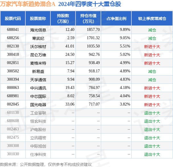 万家汽车新趋势混合A为混合型-偏股基金,根据最新一期基金季报显示,该基金资产配置:股票占净值比85.43%,无债券类资产,现金占净值比13.31%。基金十大重仓股如下: